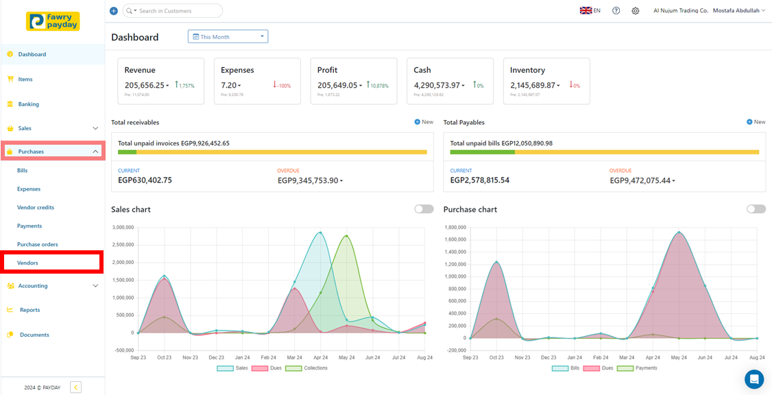 1- Navigate to “Purchases” in the main menu and click on “Vendors.”