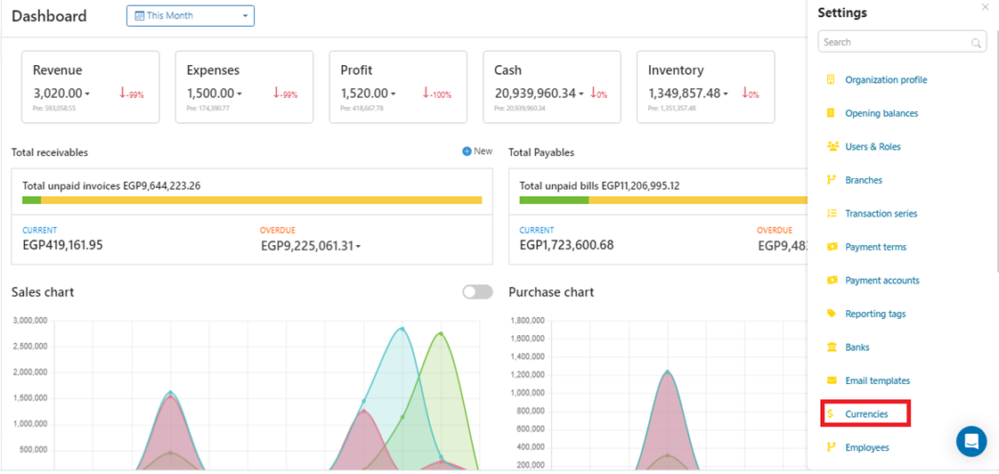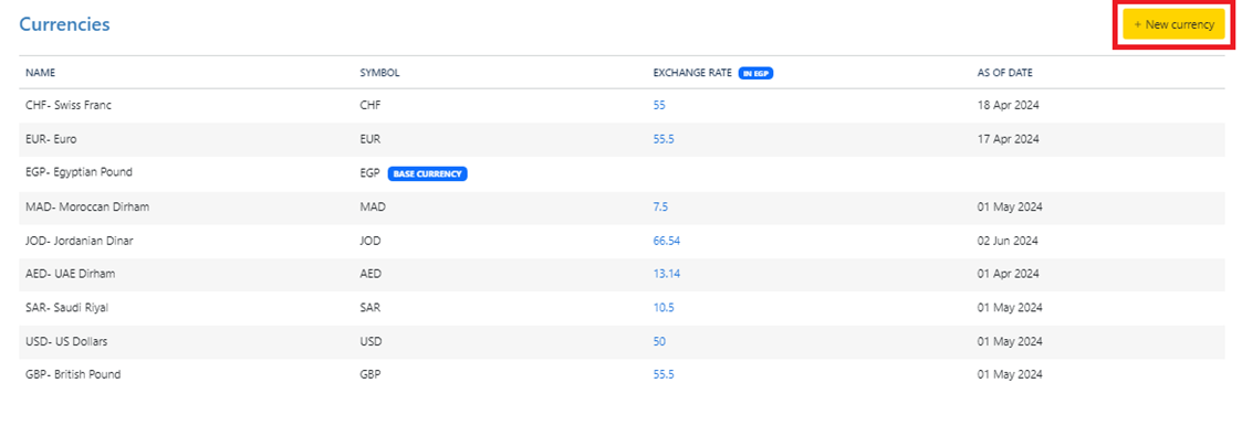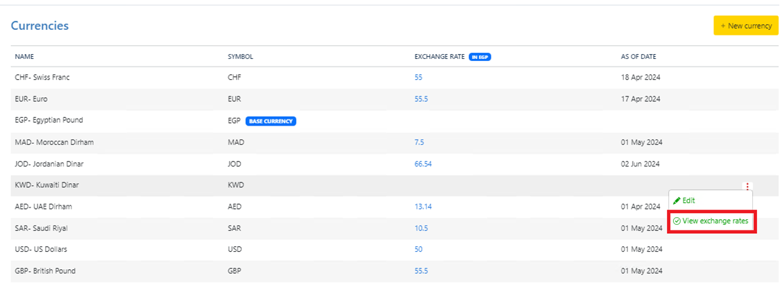 5 - Now to add the exchange rate of the new currency to Egyptian pound, hover over the new currency and click on the three dots and select “view exchange rates”