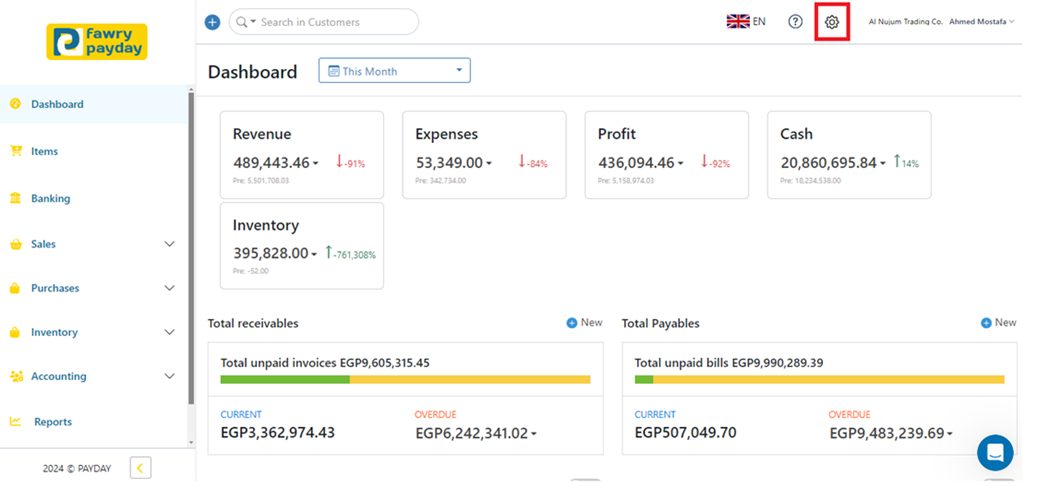1- Navigate to the toolbar menu and click on the gear icon (Settings)