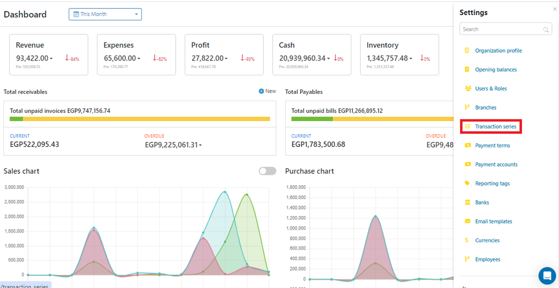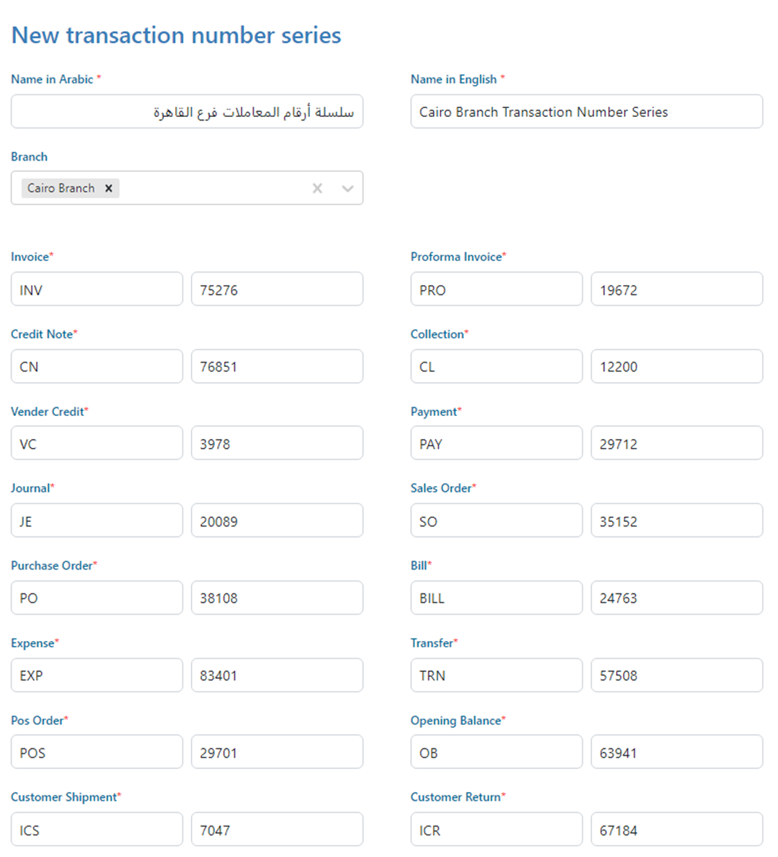 Transaction Series is a configuration interface used to define and manage the sequential numbering and prefix settings for various transactional documents within the system. This window ensures that each document type, such as invoices, purchase orders, or receipts, is uniquely identifiable through a systematically generated sequence number.