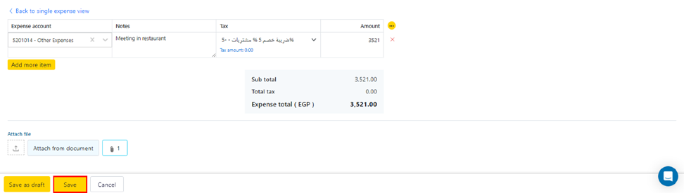 5- Save: You can either save the Expense as a draft by clicking "Save as Draft" or save it by clicking "Save."