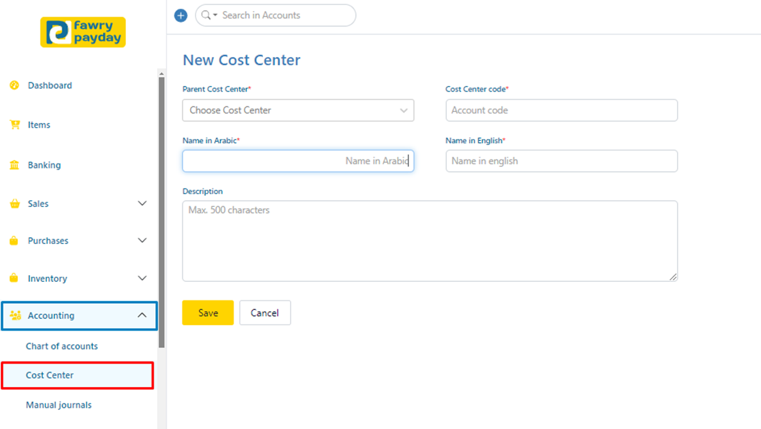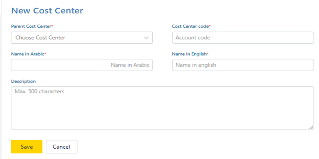 · Name in Arabic: write the cost center name in Arabic.